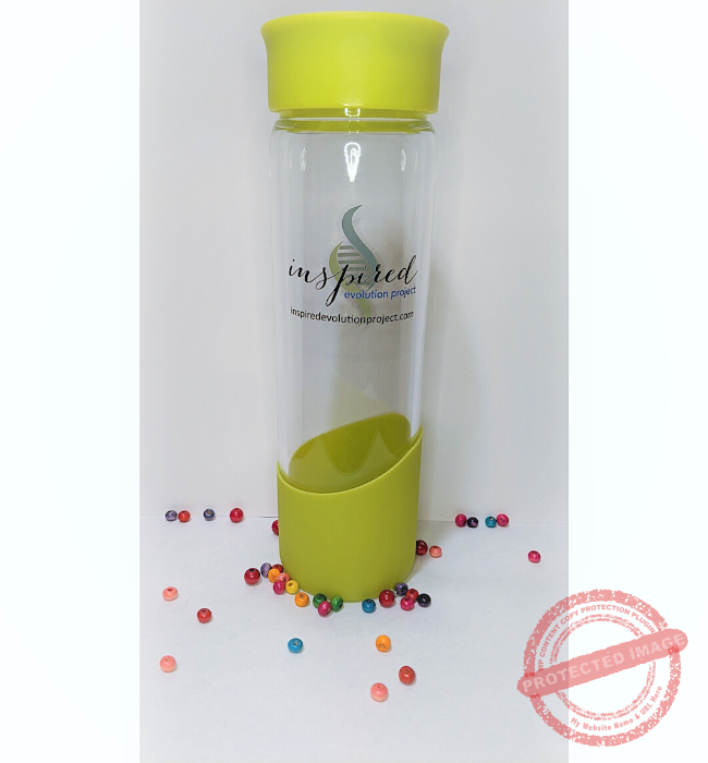 A borosilicate glass water bottle with silicone protective bottom. The borosilicate glass resists chemicals and acid degradation. In other words, unlike metal water bottles, nothing will seep into your water. The inspired evolution project logo is printed on the front and back for an aesthetically advanced look and feel.